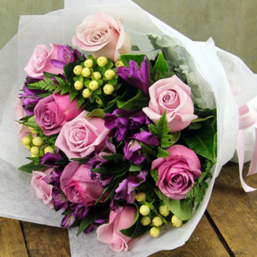 Aperçu rapide 26,00 € Bouquet Simplicité Bouquet Simplicité : bouquet de roses roses, alstroemeria violet et hypéricum blanc Plus