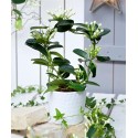 Désert Fleurissement établissement : grand bac d’accueil d’entreprise ou d’immeuble avec plantes vertes, galets blancs et boules d’inox